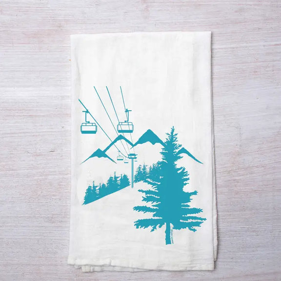 Ski Lift Tea Towel measures approx. 28" x 29". The flour sack towel is indispensable in the kitchen. It is super absorbent and dries glassware without leaving any lint. These flour sack tea towels are so durable and hardworking; they might make you want to stop using paper towels! Beautiful and functional, they also make fantastic gifts. Each image is hand-screen printed with our original illustrations.