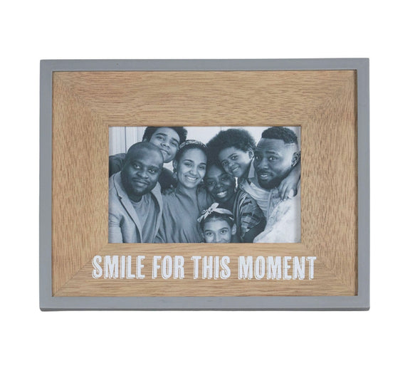 Do you need a frame that will always bring a smile? This 4x6 picture frame offers just that. Crafted of natural wood inset into a gray border and finished with a screen printed phrase in bold white lettering that reads "SMILE FOR THIS MOMENT." This photo frame can be displayed on a table or hung on a wall.
