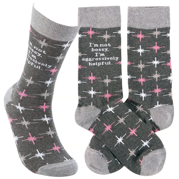 A pair of retro socks flaunting a classy pink and gray pattern with a humorous sentiment that reads "I'm Not Bossy, I'm Aggressively Helpful." These cozy socks are made with cotton, nylon, and spandex to create a one-size-fits-most design. Each pair of socks are packaged on a clear plastic hanger with header card for graceful display in store. Our I'm Not Bossy socks call back to a vintage style with modern sassy sentiments, perfect for making a statement while getting a giggle out of others. Colorful and cozy socks always make a great gift for everyday self-expression.