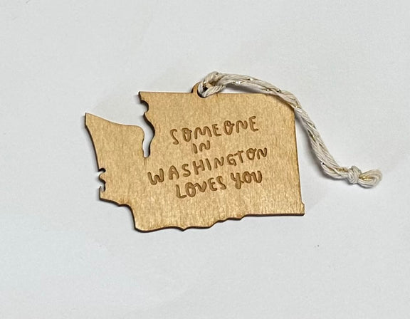 Spread the Washington love far and wide with a handcrafted ornament! Laser-cut wooden ornament in the shape of Washington engraved with the words 'Someone in Washington Loves You' in our signature handwritten font.