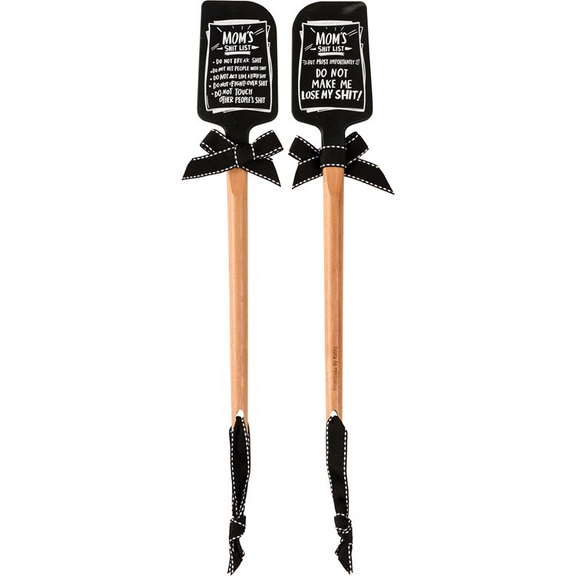 A double-sided silicone spatula featuring a paper list design with "Mom's Shit List" sentiment on one side, and paper list design with "Mom's Shit List The Most Important Do Not Make Me Lose My Shit" sentiment on the other side. Our Mom's List spatula features a logo engraved into wooden handle for added interest and a decorative bow and ribbon for hanging. Hand wash recommended; not microwave safe.
