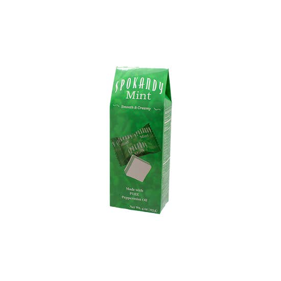 One of Spokandy's Best Sellers, packaged in a 4 oz tote gift box! These smooth & creamy mints start with white coating, colored softly in green pastels then flavored with pure peppermint oil. These are individually wrapped mints and simply delicious!