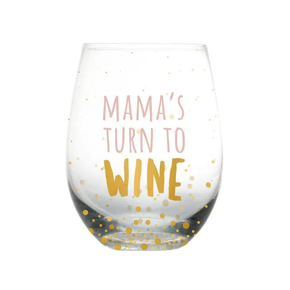 Mama’s turn to wine! Celebrate the arrival of your adorable baby and have a glass of wine. Wine glass comes with the very true and funny phrase “mama’s turn to wine” printed on the front in pink and gold. This stemless wine glass will fit a total of 16 fluid ounces. For best results, hand wash. Not microwave safe. product dimensions: 3.5” w x 4.75” h x 3.5" d.