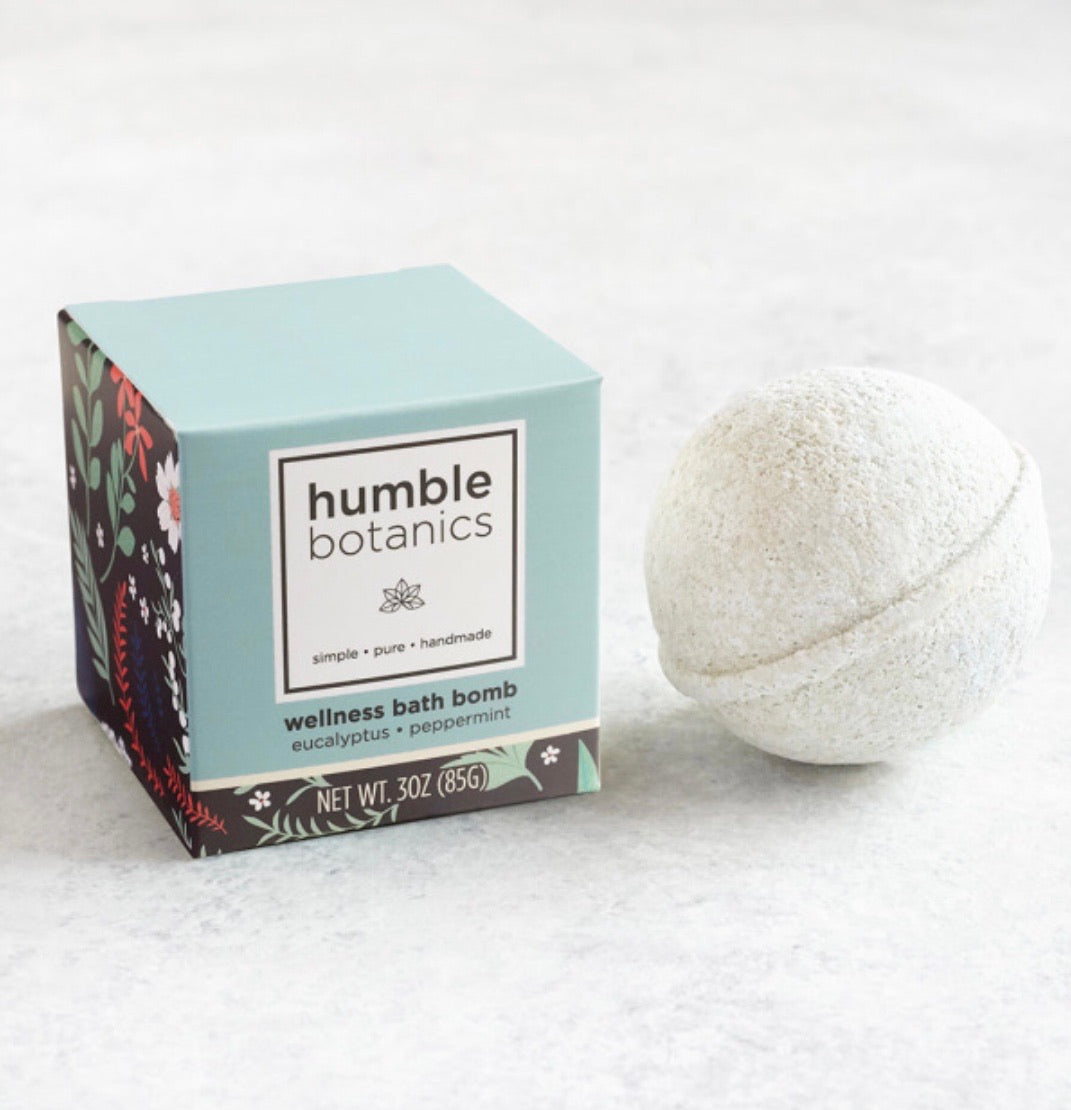 handmade Wellness Bath Bomb Single includes 1 3oz bath bomb that softens skin and provides aromatherapy. Instead of using harmful chemicals, dyes, and fragrances to achieve color and scent, we've developed a simple, non-toxic approach. This product is comprised of french green clay, and a blend of organic eucalyptus and peppermint essential oils. Finally, a bath bomb product the whole family can feel good about soaking ALL in!