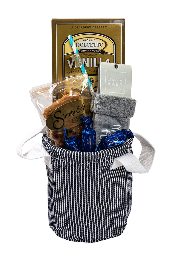 Welcome a new baby to the world by sending this thoughtful baby themed gift basket. New cozy socks included for baby and yummy treats for Mom and Dad. Plus the canvas reusable container is the perfect storage or organization bin for the new nursery!