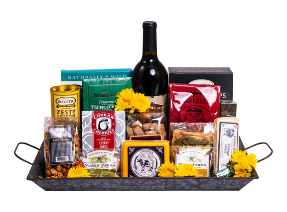 Send sunshiny wishes with our Summer inspired gift. Built on top of a beautiful Sunflower design tray is a bottle of red wine, cheese, crackers, seasoned pretzels, our famous soft peanut brittle, butter toffee peanuts, chocolate covered Bing cherries, best-selling Spokandy dinner mints, our exclusive Grandma Rubin's Peppernuts gingersnap cookies, gourmet chocolates and more.