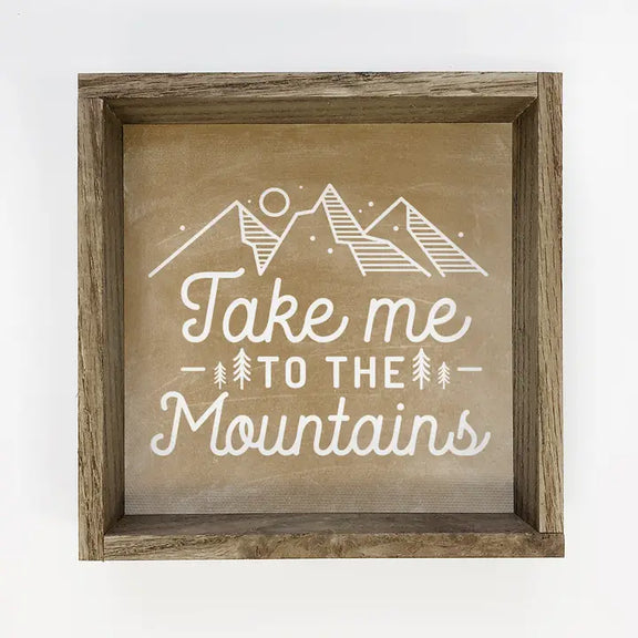 Elevate your space with the tranquil allure of this beautiful art print, featuring a charming white chalk-like drawing of a simple mountain range. Below, the whimsical cursive phrase "Take me to the Mountains" adds a touch of wanderlust, accentuated by adorable pine tree stick figures. Hang this delightful piece in your living room or study to create a serene escape within your home.