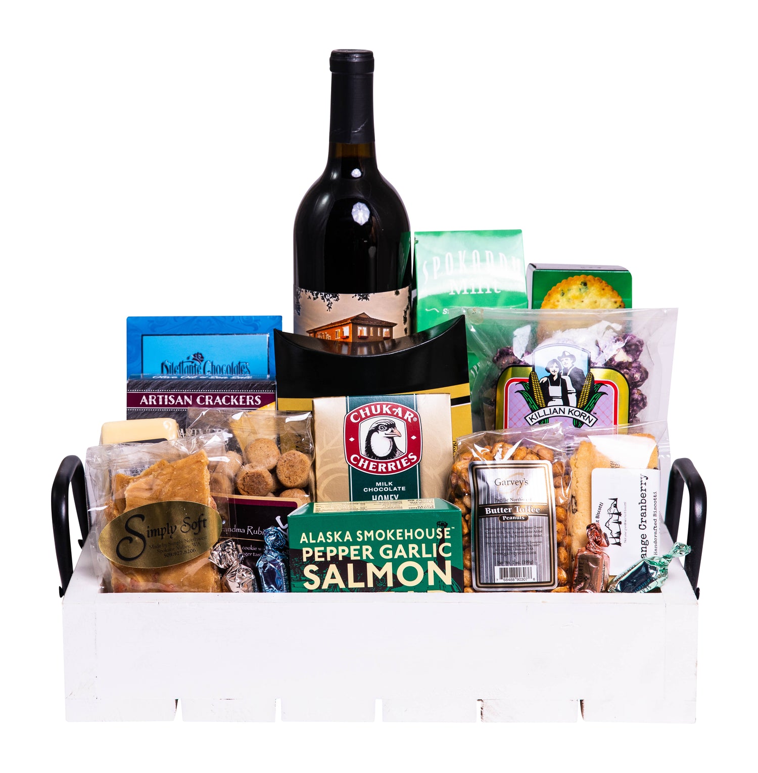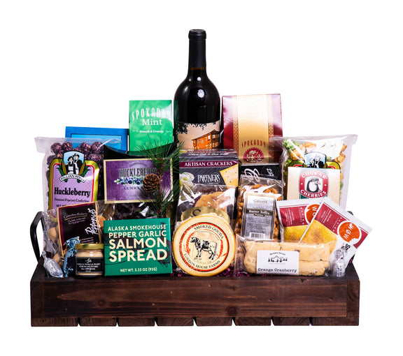 When you need presentation on a grand scale, this classic collection is the very essence of gift giving! Packed full of Northwest pleasures such as Washington red Wine, smoked salmon, crackers, decadent Northwest chocolates & cookies, our famous soft peanut brittle, gourmet huckleberry popcorn, savory nut mix, our best-selling and exclusive Grandma Rubin's Peppernuts gingersnap cookies, butter toffee peanuts, gourmet huckleberry flavored candies, delicious caramel apple popcorn and lots more.