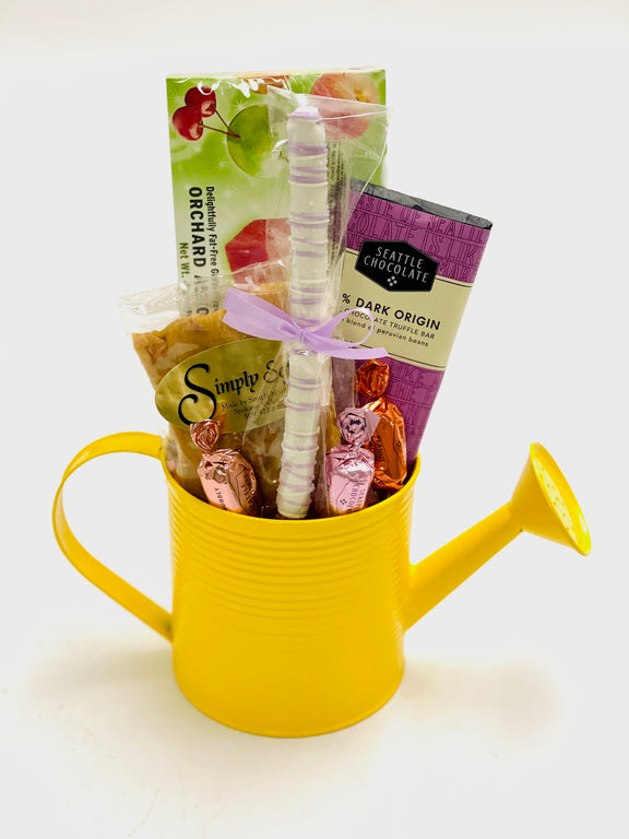 Our bright and cheery reusable watering can container comes filled with such goodies as a chocolate covered pretzel, our famous soft peanut brittle, a variety of gourmet chocolate truffles, and sweetly flavored candies.