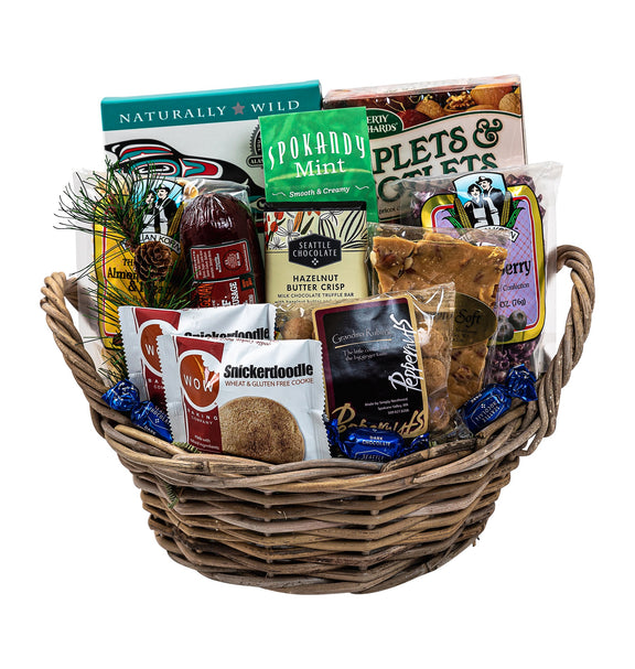 Enjoy all the best flavors of the Northwest with this regionally inspired gift basket. Tucked inside is smoked salmon, sausage, Washington's famous Aplets & Cotlets fruit and nut candies, our famous soft peanut brittle, decadent chocolates, gourmet popcorn, gluten free cookies and more!