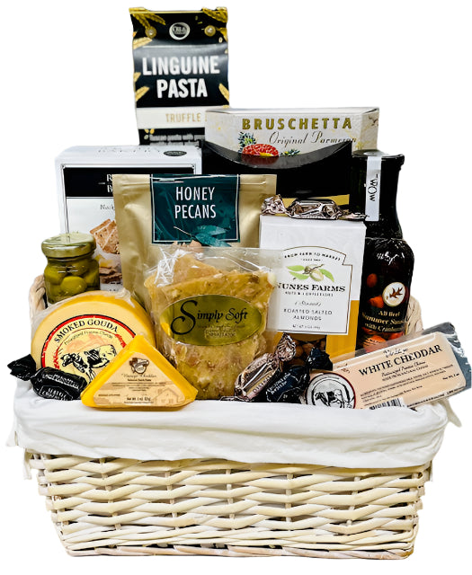 Indulge in the ultimate gift experience with our Deluxe Gift Basket, a curated collection of gourmet delights that promises to impress. This luxurious basket features a handpicked selection of premium items including gourmet pasta, savory crackers, smoked salmon, Walla Walla sweet onion vinegar, our Simply Soft peanut brittle and so much more!