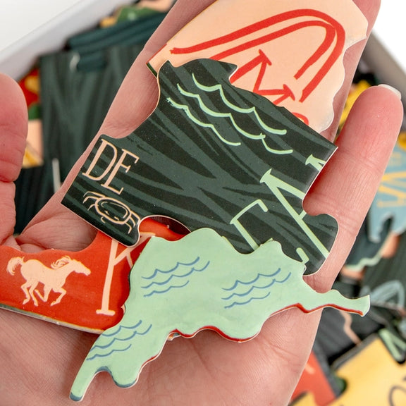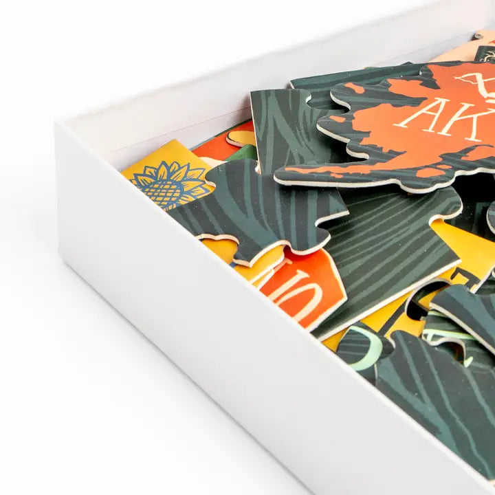 Explore the United States of America with our one-of-a-kind, hand-painted puzzle. The uniquely state-shaped pieces and beautifully illustrated designs make this puzzle a fun and educational activity for kids and adults alike. With only 110 pieces, it's the perfect gift for children and a great addition to any teacher's classroom. Format| 110 pieces Ages| 8+ Difficulty| Easy Size| Complete puzzle:18" x 24"; Box Size: 8" x 10" x 2" Product Type | Puzzle Title | The United States of America Puzzle