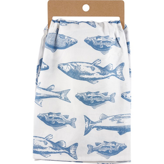A white cotton kitchen towel displaying all-over print of fish and "Lake Life" sentiment in river blue color. Our Lake Life kitchen towel is machine-washable for convenient cleaning. Packaged on a cardboard hanger with hole to easily display on rack. A fun and functional outdoor-themed kitchen accent.