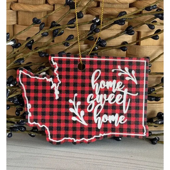 Washington State Home Sweet Home Acrylic Christmas Ornament. Laser engraved ornament that measures 4" X 3.5" and comes with a gold cord for hanging. This is a great gift tag for a first time home buyer. The front is laser engraved with white as shown in the photo and the back is red and black plaid with no engraving.