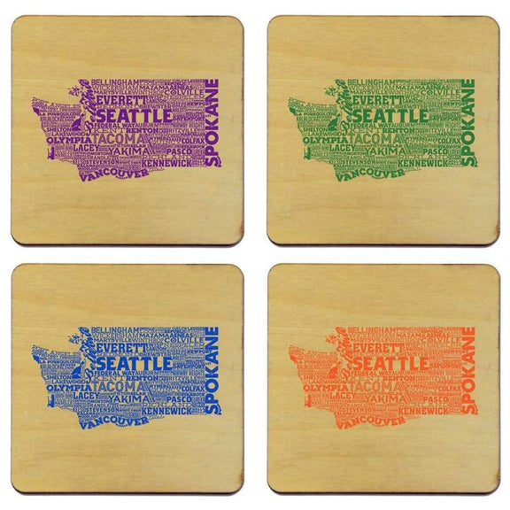 Show your state pride with this beautiful typography coasters. Each coaster measures 4″x 4″ and is 1/4″ thick. Made of Baltic birch, these coasters come in a pack of four in different colors. Each coaster is UV printed with city names tomake the coasters extra special and unique.