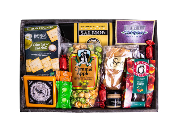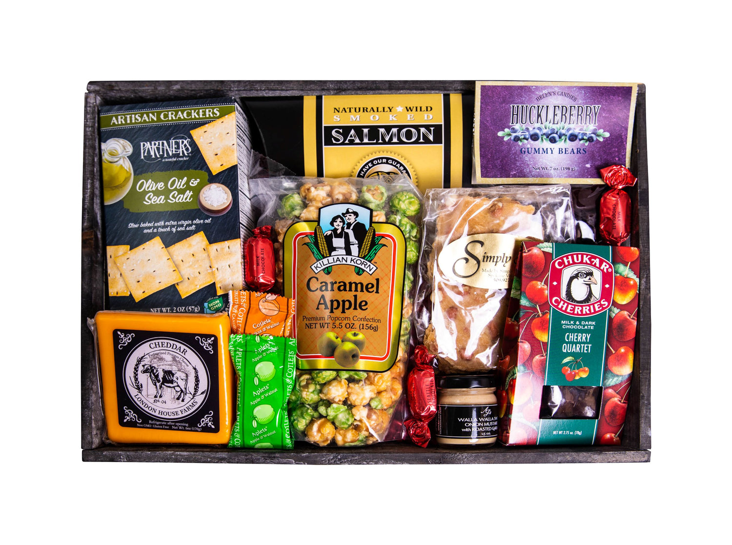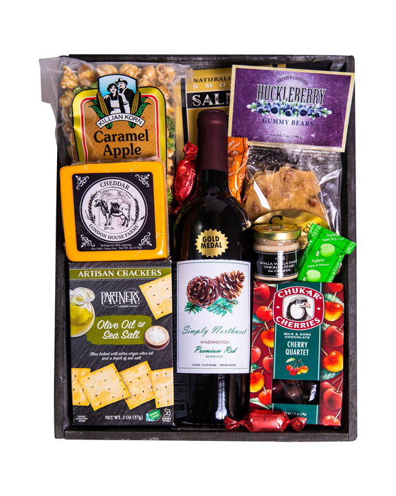 Our beautiful state is home to some of the most distinct specialty foods and flavors and we’ve captured them inside this warmhearted selection. Each gift comes with smoked salmon, crackers, gourmet caramel apple popcorn, sweet huckleberry flavored gummy bears, Walla Walla sweet onion mustard, our famous soft peanut brittle, milk and dark chocolate covered Bing cherries, Aplets & Cotlets fruit and nut candies, and a variety of chocolate truffles. Enjoy a bottle of Washington premium red wine or Chardonnay in our $99.99 selection.
