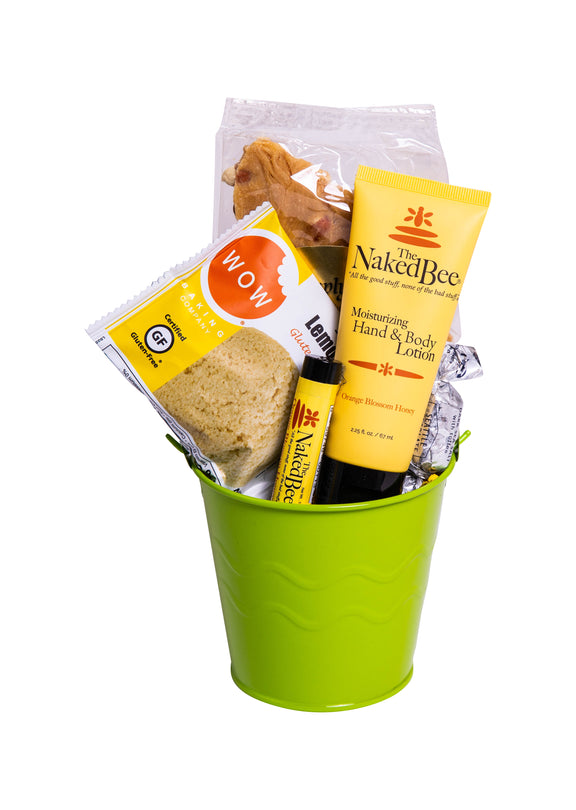 Say Thank You with this bright and cheery gift which comes filled with hand lotion, lip balm and hand sanitizer from our popular and best selling body care line Naked Bee. Also included is a variety of gourmet chocolate treats.