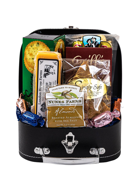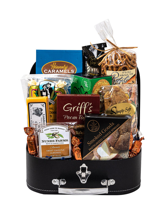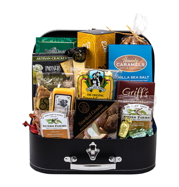 Show Mom how much you TREASURE her with this beautiful gourmet gift basket. She will love the reusable paperboard chest that comes filled with gourmet popcorn, cheese, crackers, our famous soft peanut brittle, Savory nut mix, gourmet chocolates and more!