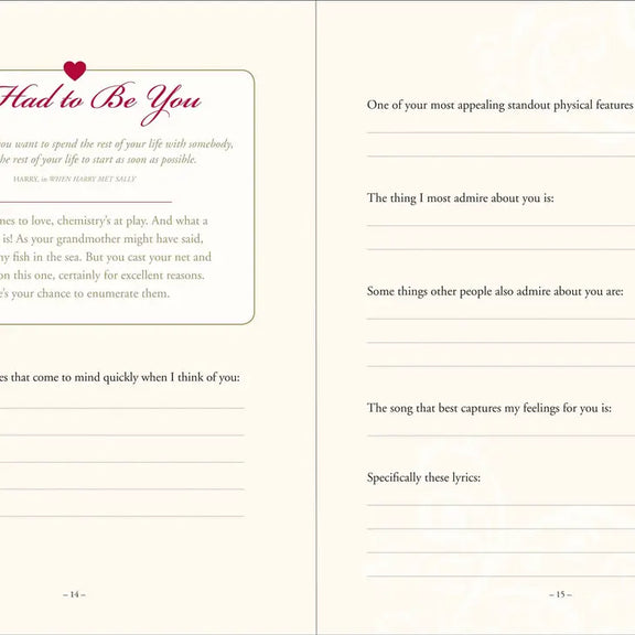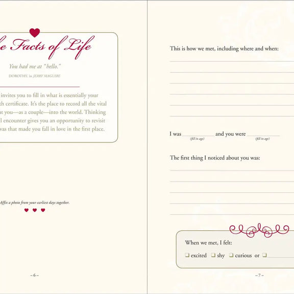 Write your love story in your own words! Designed to be filled out by one partner and given to the other, or to be explored as a couple, the prompts and questions in this guided journal offer fun and insight into your relationship. Provides plenty of space for answers and photos. Contents include: Introduction, The Facts of Life, It Had to Be You, We Go Together, Just the Two of Us, Through the Test of Time, How We Roll, Can You Imagine?, The Best Is Yet to Come. Opaque, smooth-finish pages take pen beautifully. 120 gsm paper is acid-free and of archival quality. Cover design is embossed and embellished with glossy heart-shaped highlights and gold foil accents. Durable hardcover binding. Keepsake journal measures 6-1/4'' wide x 8-1/4'' high. 96 pages.