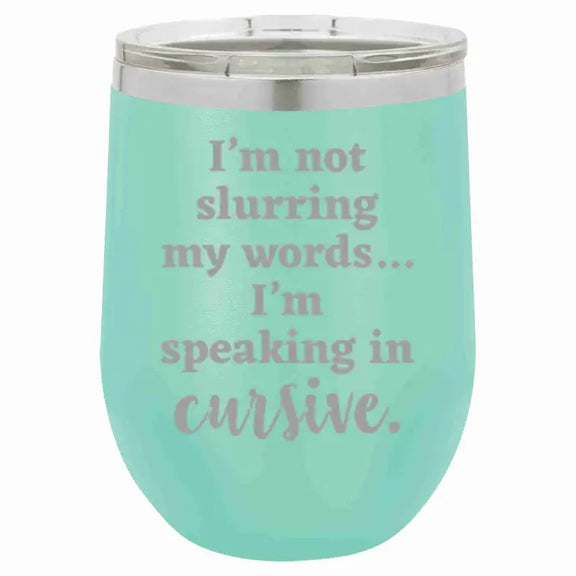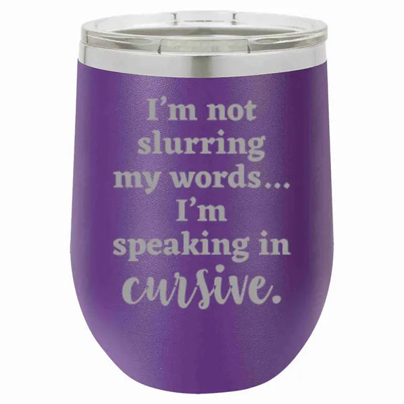 Engraved 12 oz wine tumbler with a durable powder coated color. All tumblers are engraved to insure the writing will never peal or fade. This tumbler comes with the phrase "I'm Not Slurring My Words... I'm Speaking In Cursive."