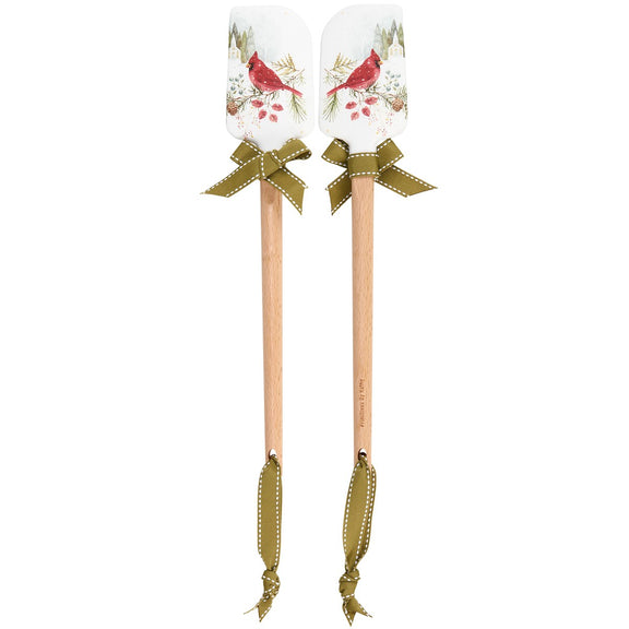 A double-sided silicone spatula displaying a charming design of a cardinal on a winter branch replicated from original artwork hand painted in a delicate watercolor style. Our Winter Cardinal spatula includes a coordinating decorative bow and ribbon at the bottom for hanging. Hand-wash recommended; not microwave safe. A winter-themed kitchen accessory perfect for seasonal use.