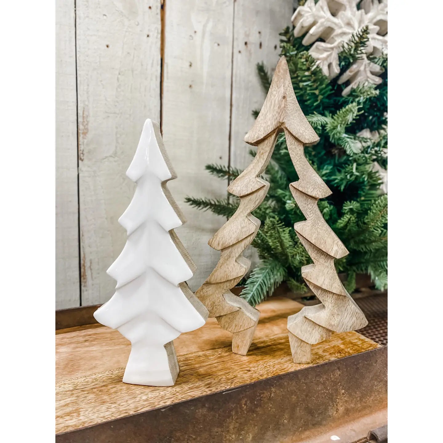 Add dimension and rustic elegance to your holiday décor with this charming 2-piece 3D tree set. Crafted from natural wood and accented with glossy white ceramic, these trees bring a perfect balance of farmhouse warmth and modern simplicity. Their layered, dimensional design makes them stand out as eye-catching accents for mantels, tabletops, shelves, or festive centerpieces.