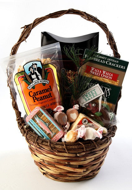 This fish themed gift basket is perfect for any fisherman Dad, Grandpa, Son, Brother or Uncle. Each basket contains smoked salmon, cheese, crackers, gourmet popcorn, Salmon or Trout shaped goodies, a variety of salt water taffy, and other fish themed treats.