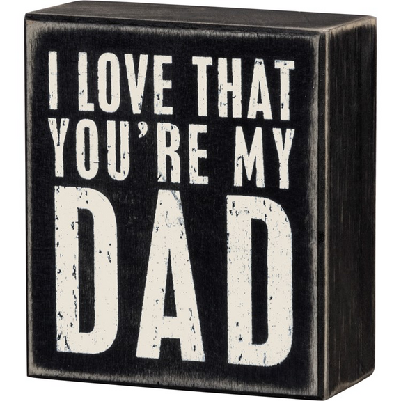 A classic black and white wooden box sign featuring a distressed "I Love That You're My Dad" sentiment. Easy to hang or can free-stand alone