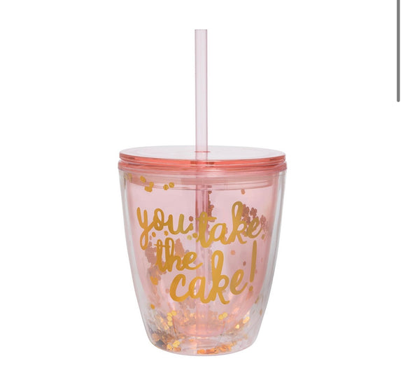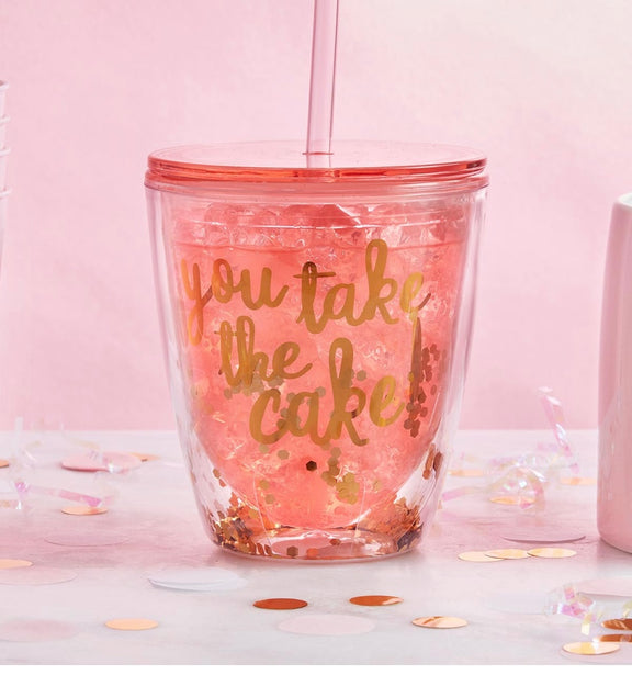 - Pink tinted / see-thru coloration with the phrase "You Take The Cake" in gold lettering