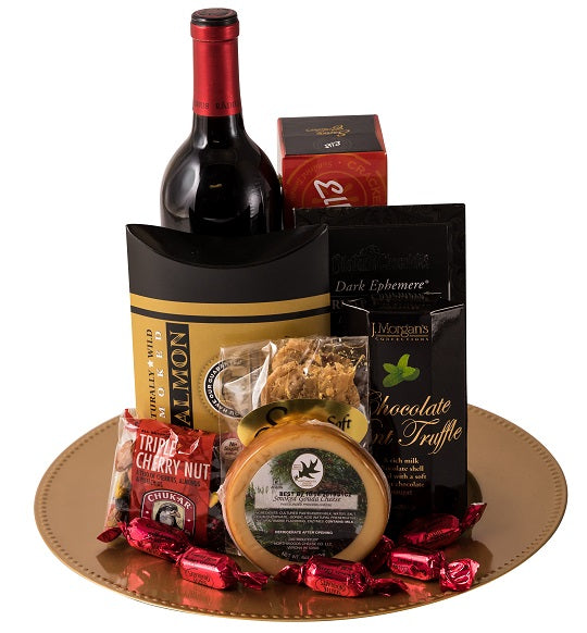 Show your love with our elegant and best selling wine gift! Tucked inside is a bottle of Northwest red wine, smoked salmon, gourmet cheese, crackers, our famous soft peanut brittle, nuts, and a lovely variety of gourmet chocolates.